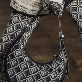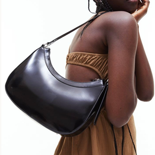 La borsa a tracolla a mezzaluna, pescata dagli anni ‘80, comoda visto che ci lascia le mani libere; libere di tenere in mano il cellulare o di cercare il porta credit card!